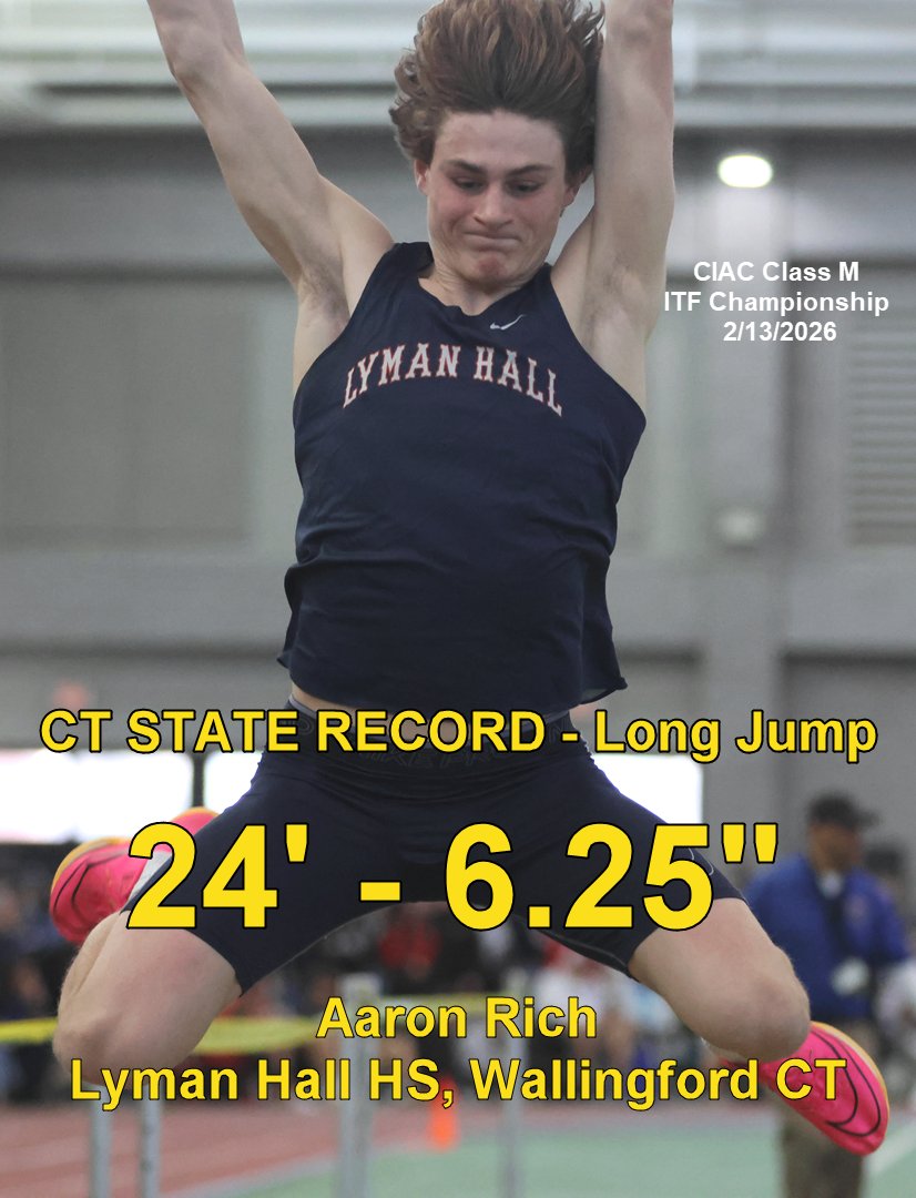 Official congrats to Lyman Hall’s Aaron Rich who set CT long jump state record with a leap of 24-6.25 at the CIAC Class M ITF Championships Friday night!