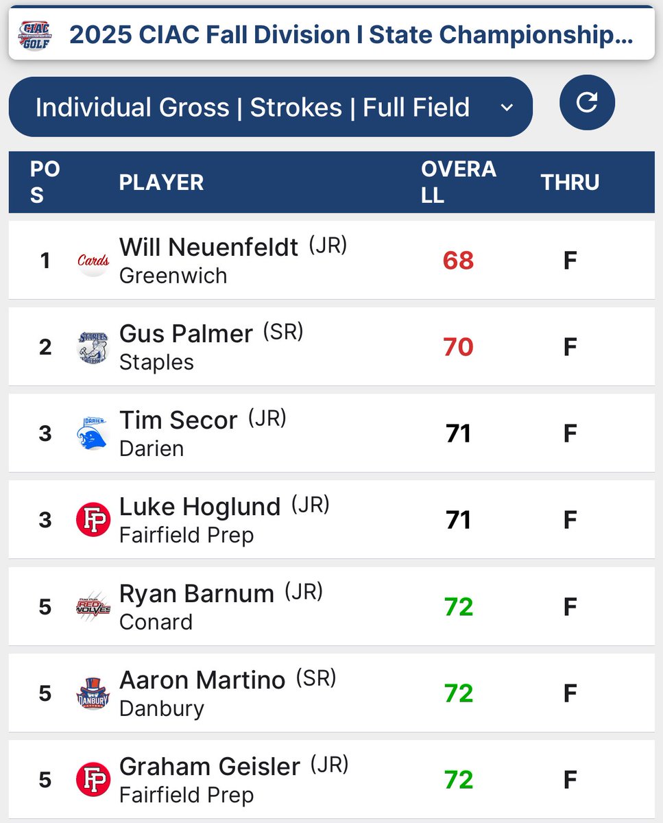 The top four medalists of today’s Division I State Championship were Will Neuenfefeldt (Greenwich), Gus…